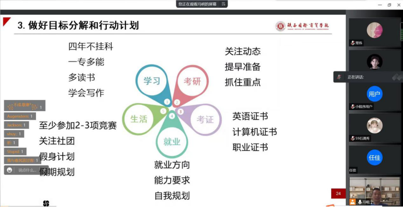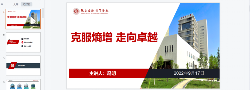 为帮助2022级新生坚定理想信念,树立远大理想,尽快适应环境,合理规划大学生活,9月17日下午2点30分国际经济学院组织全体新生召开线上入学教育活动,由学院副院长冯明担任主讲人,以“克服熵增,走向卓越”为题进行线上指导。