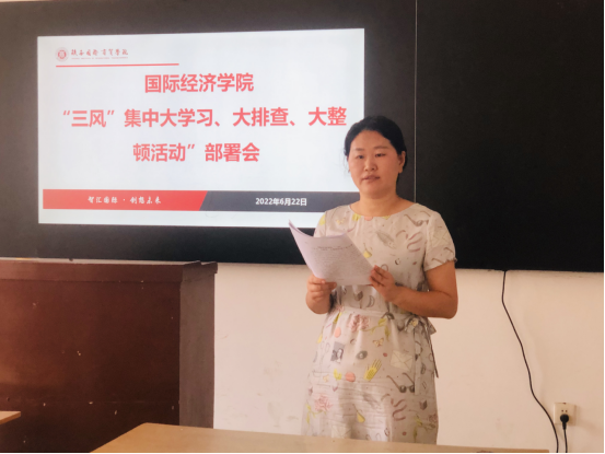 会上,路敏书记根据学校《关于开展我校“作风、教风、学风”建设突出问题大排查的通知》的要求,结合我院工作实际,宣读了《国际经济学院“三风”集中大学习、大排查、大整顿活动工作方案》。她指出要切实推进“作风、教风、学风”集中大学习、大排查、大整顿工作落地见效,着力解决我院工作中存在的突出问题,使学院管理更趋规范、科学,全面提升教育教学质量。
