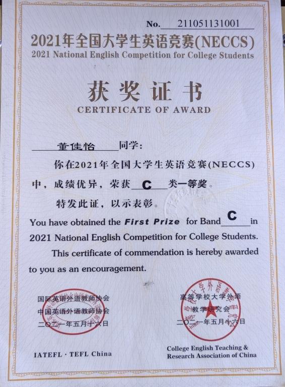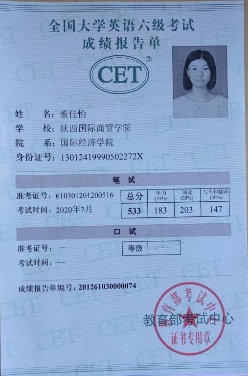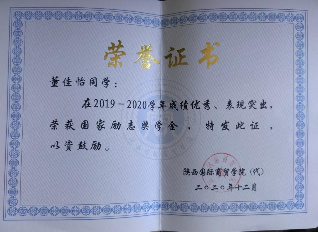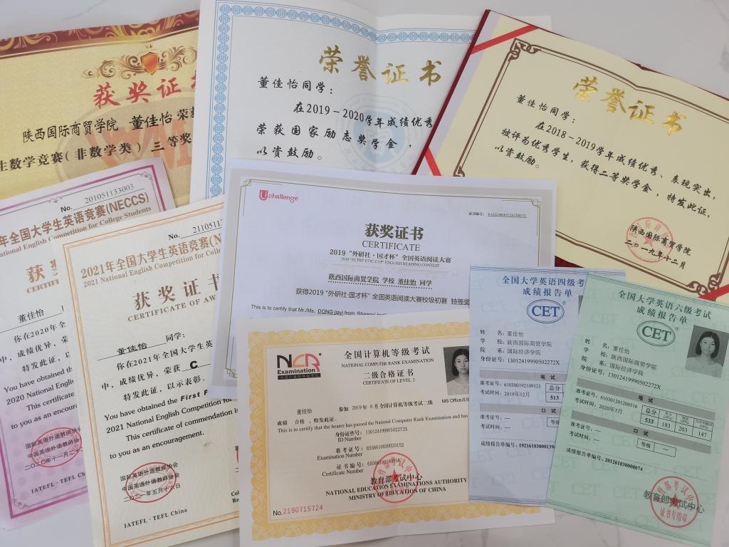 时光荏苒,岁月如梭,在陕西国际商贸学院学习的宝贵四年生活中,她深知“宝剑锋从磨砺出,梅花香自苦寒来”,本科期间凭借着自己的勤奋努力,曾获国家奖学金、国家励志奖学金,优秀学生二等奖学金,通过英语四六级考试、计算机二级考试、证券从业资格证考试,并多次参加各类知识竞赛,在全国大学生英语竞赛中获得一等奖,全国大学生数学竞赛获得三等奖的优异成绩。