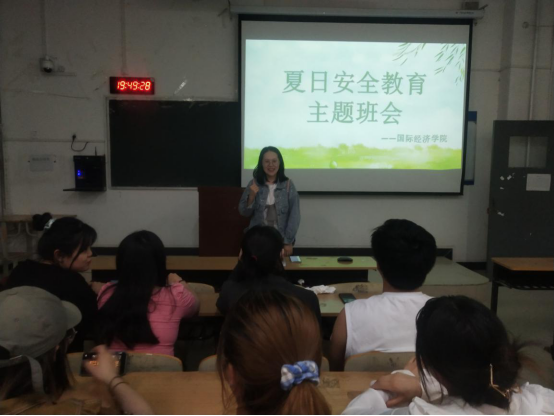 为教育引导学院学生牢固树立自我安全防范意识,提升自我安全防范能力,2021年6月2日晚19:30,国际经济学院2018级辅导员李彤辉老师组织2018级全体学生在2J129开展了夏季安全主题教育班会。