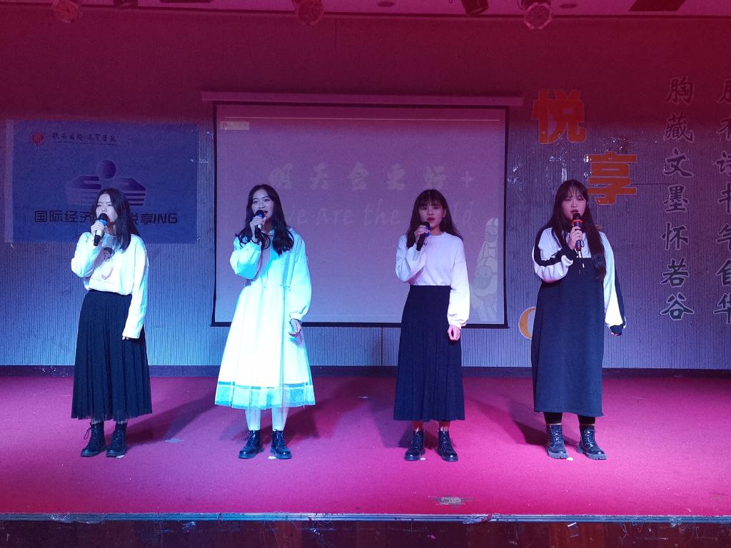 本次节目以“致敬最美逆行者”为主题。活动伊始以三个情景剧汇编的小剧场——《在一起》拉开了本场活动的帷幕。小剧场讲述了在疫情期间,不同身份的岗位面临的职责,最后由同学们扮演的医护人员铿锵有力的宣誓声,赢得了在场观众的热烈掌声,凸显活动致敬的主题。第二部分分享环节,节目现场请到了疫情期间国际经济学院四位参加过志愿者活动的同学,分享在做志愿者的经历和感触。由姜欣玉、陈卓远等带来的朗诵《同气连枝,共盼春来》,歌颂着最美逆行者可歌可泣的事迹,八位同学通过真挚的情感把节目氛围推向了高潮,台下持续响起了热烈的掌声。接着许梦凡、赵俊梅等四位同学带来的歌曲《明天会更好》也萦绕在观众们的心扉,歌词中表达了同学们以积极的态度与勇气去面对未来,为英雄而歌唱,为光明的未来而歌唱。