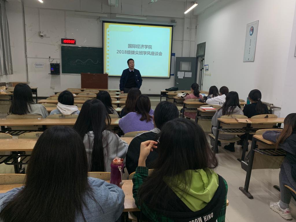 为强化2018级拔尖班学风建设及帮助其规划后期目标,2020年10月14日19:00,国际经济学院2J127多媒体教室召开拔尖班学风座谈会,学院副院长冯明副教授,辅导员李彤辉以及拔尖班全体同学参加会议。