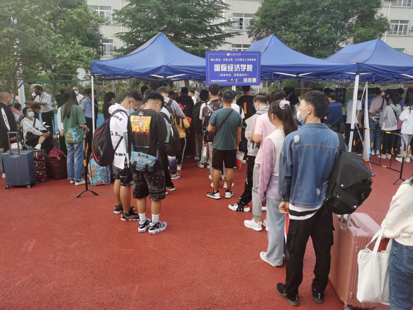 2020年9月17日,欢迎2020“小萌新”的第一天,迎着曙光,踏着晨露,国际经济学院张书记带领专职教师、辅导员以及党员干部、学生会、团总支共五十余名学生组成迎新志愿者服务队,助力迎新工作。他们分别进行家长引导、新生引导,缴费引导,体温测量,咨询服务,党员服务,公寓物品登记,秩序维护,校园巡查,专业讲解等多个工作。