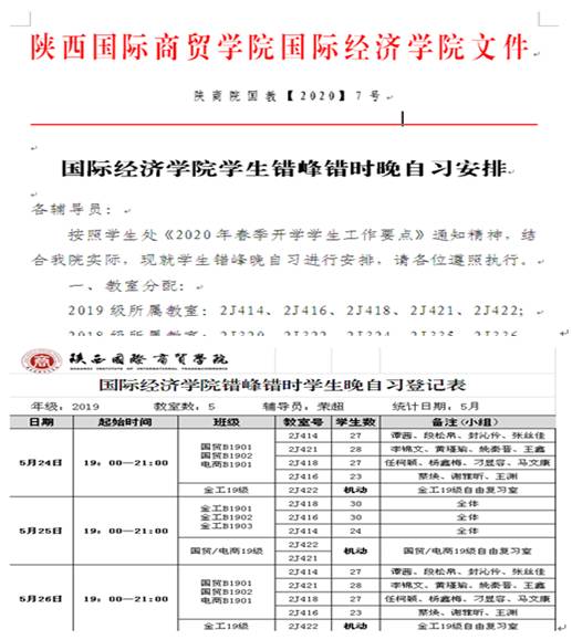 依据学生工作处有关安排,为有序恢复正常教学秩序,国际经济学院结合返校学生实际,严格按照防疫工作有关要求,制定了《国际经济学院学生错峰错时晚自习安排》,安排结合各年级学生人数及教室数量,按照单人单桌,错峰错时原则,对学生晚自习室进行了科学合理安排,做到防疫防控与日常教育管理相结合。5月24日晚,我院各年级错峰错时晚自习学生出勤井然有序。