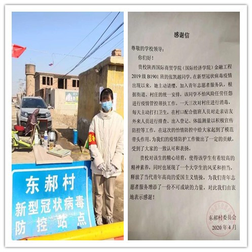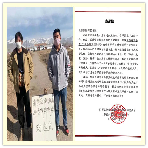 3月20日,青海省门源县向陕西国际商贸学院国际经济学院送来感谢信,感谢国际经济学院金融工程B1704班王斌元同学近段时间以来对东平社区抗疫工作的支援。此外我们还收到了东郝村村委会送来的感谢信,感谢国际经济学院金工B1901班张凯越同学在当地疫情防控工作中的贡献。