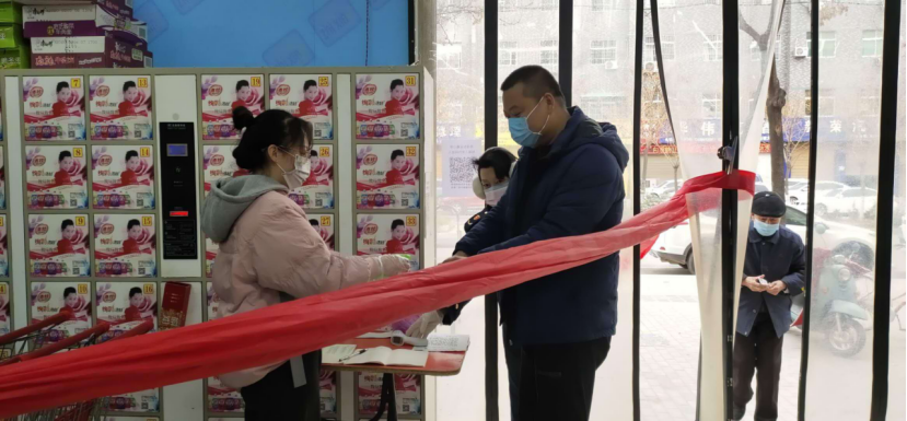 国际经济与贸易B1901班张奥。她在陕西省渭南市大荔县超市西二环店义务服务,负责给顾客测体温、消毒等。