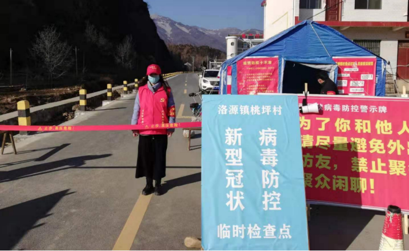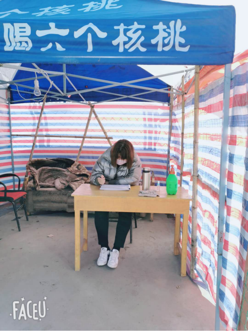 金融工程B1802师媛。她在陕西省商洛市洛南县洛源镇桃坪村,主要负责每天早上十点到下午四点外来人员的体温检测,登记和劝阻工作。