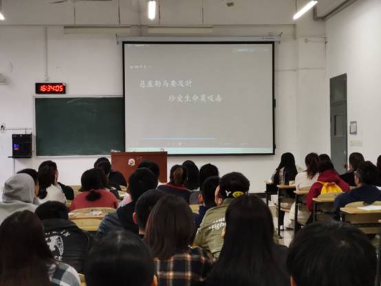 活动开始,辅导员徐亚岚老师通过幻灯片、具体实例等多种形式向同学们介绍了毒品的概念、分类、特征、生理危害、心理危害、社会危害,并且向同学们讲解了吸毒的原因及易染毒渠道,毒品违法犯罪及其处罚,掌握远离、拒绝毒品的方法与技能,使得同学们充分了解禁毒历史与现状,特别是近些年发生的涉毒事件,深刻了解毒品的危害性,提醒同学们时刻注意远离、拒绝毒品的诱惑,如果发现身边有吸毒行为,一定要及时报警。随后,同学们观看了禁毒视频,视频将吸毒人员的故事生动、鲜活的呈现在荧幕上,深入揭露了吸毒导致的精神、身体的双重摧残,那一幕幕让同学们感受颇深。与此同时,徐亚岚老师再次呼吁同学们远离毒品,学会对毒品说NO。