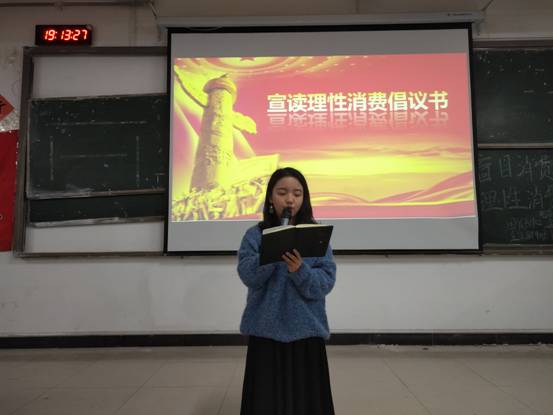 活动伊始,团总支宣传部长王梓怡同学宣读理性消费倡议书,倡议同学们要理性对待“双11”活动,要量入为出,适度消费,不可盲目跟风,要克制冲动消费,树立理性消费观。