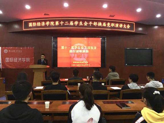 2019年10月24日19:00,我院第十二届学生会干部竞职大会在经济管理实验示范中心D区如期举行。出席本次大会的有学院团总支书记荣超老师,辅导员李义玲老师,团总支副书记李斌以及学生会新老学生干部。
