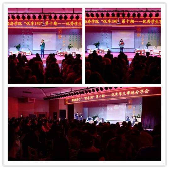 “胸藏文墨怀若谷,腹有诗书气自华”。为进一步加强学风建设,充分发挥先进典型的示范和引领作用,集中展示我院大学生积极健康向上的精神风貌,引导广大同学向先进典型学习,坚定理想信念,明确发展方向。12月24日晚19:00,国际经济学院在学术报告厅三楼举行悦享ING”第十期优秀学生事迹分享会,学院党总支副书记张孝峰、学生科科长荣超、专职教师代表、全体辅导员以及年度获奖学生和300余名同学参加了活动。