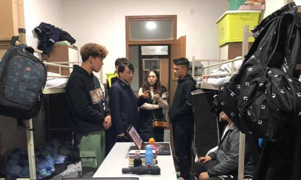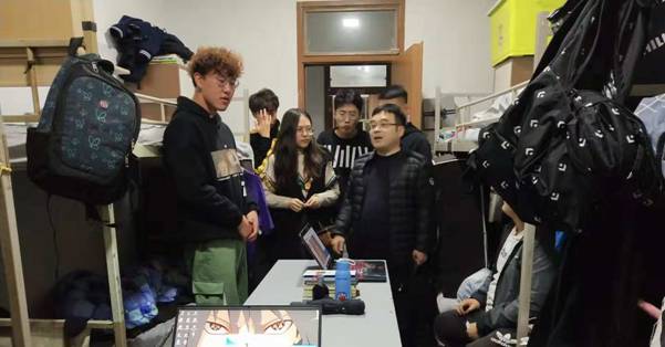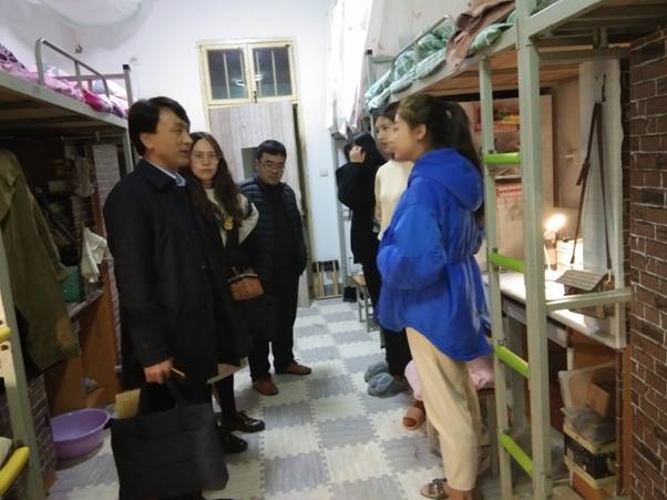 2018年11月13日21:30,国际经济学院党总支副书记张孝峰、学生科科长荣超、全体辅导员老师走进学生宿舍,慰问国际经济学院的在校学生,与同学们深入交谈并提醒大家注意冬季安全。