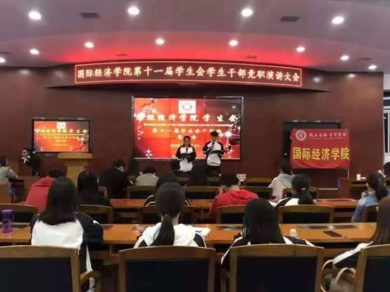 2018年10月24日晚19:00,国际经济学院在经管实验教学示范中心隆重举行第十一届学生会干部竞聘大会。学院党总支副书记张孝峰、团总支书记荣超、辅导员徐亚岚、李彤辉老师以及学院新老学生干部参加了会议。