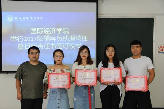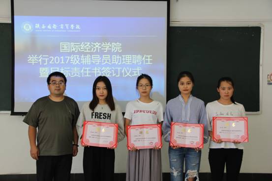 会上,由学生科科长荣超宣读了《国际经济学院关于聘任张含等8名同学担任辅导员助理的决定》;详细解读了辅导员助理目标责任、聘用条件、工作职责、日常工作及考核管理办法并和受聘辅导员助理签订了2017年度目标责任书,同时为受聘辅导员助理颁发了聘任书。