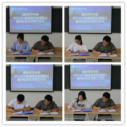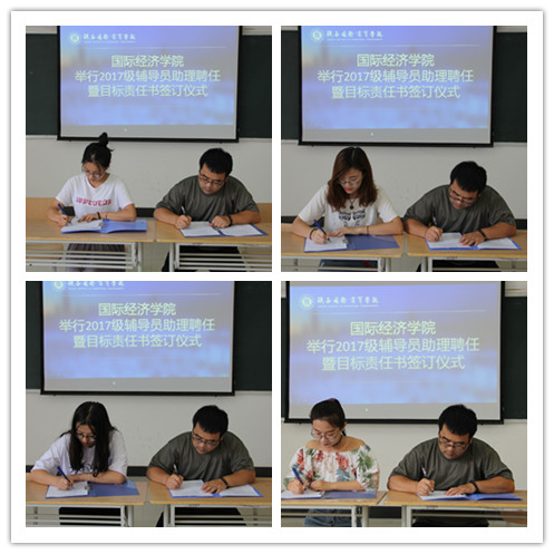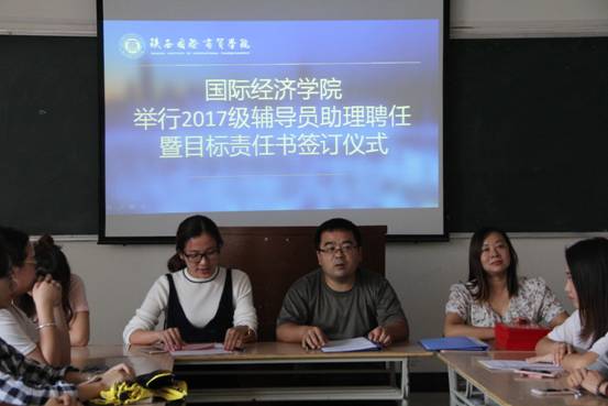2017年9月11日下午16:30,国际经济学院在2J322多媒体教室举行2017级新生自然班辅导员助理聘任暨目标责任书签订仪式,学院党总支副书记张孝峰、学生科科长荣超,辅导员常伟、祝培刚以及全体辅导员助理和17级班委参加了会议。会议由辅导员徐亚岚主持。