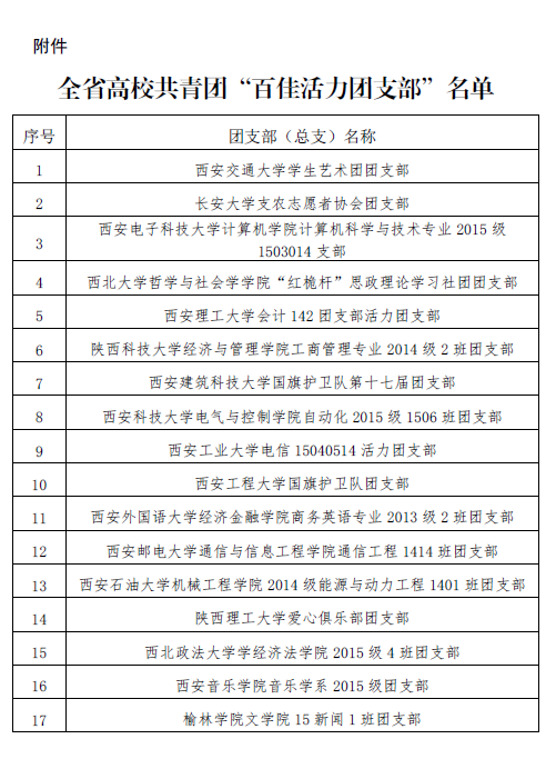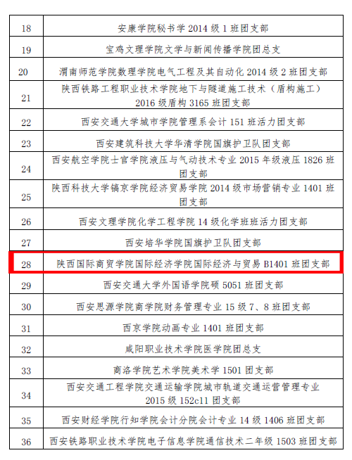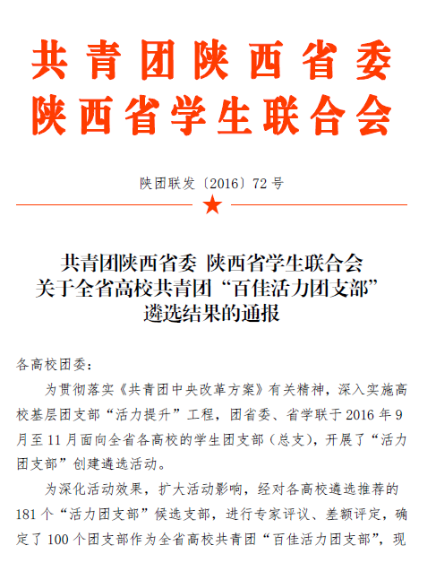 近日,共青团陕西省委为贯彻落实《共青团中央改革方案》有关精神,深入实施高校基层团支部“活力提升”工程而开展的陕西省“百佳活力团支部”创建遴选活动结果公布。国际经济学院国贸B1401班团支部获批2016年陕西省高校共青团“百佳活力团支部”称号。
