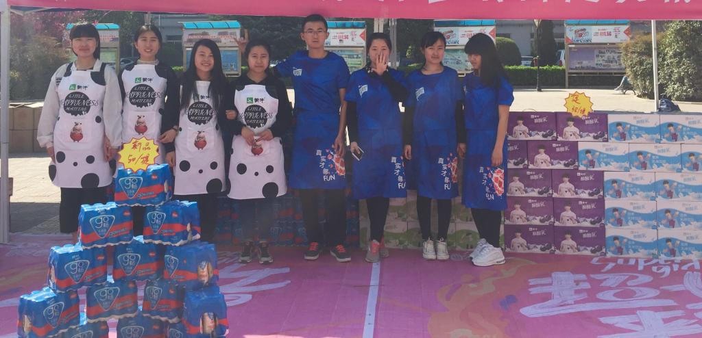 活动期间,该协会的同学们结合课堂所学营销理论知识,不论是在产品的摆放设计还是营销方式上,都下了一番苦功;为使提高顾客的消费积极性,同学们还专门设计了多项有奖互动的游戏环节,还用自己独特的营销方式(说唱跳)来吸引消费者的眼球。对于每位顾客,他们总能热情招待并能够很专业的向顾客详细介绍产品的相关属性。对此,得到了蒙牛公司相关负责人的肯定,并且希望能够长久合作。