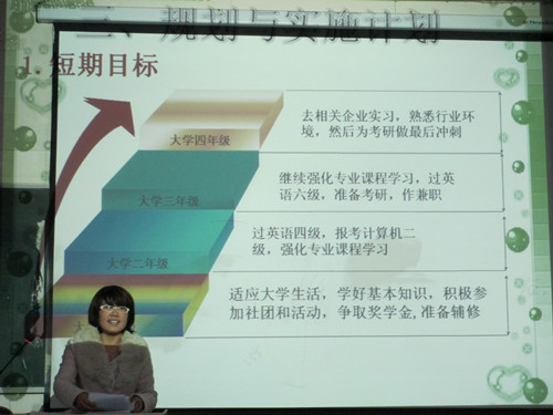 比赛开始前,学生工作办公室李老师简要介绍了举办此次活动的目的,并希望参赛选手能在比赛中取得理想成绩。在比赛过程中,各位参赛者用多媒体展示了职业规划PPT同时做相关说明,许多参赛选手通过SWTO分析、霍兰德职业测试进行自我及就业环境剖析,找出自身优势劣势,制定出合理的就业准备及职业规划。内容详细,思维缜密,声情并茂,一次次博得同学们阵阵掌声。比赛选手六人一组,个人成绩依次在比赛过程中揭晓,全程安排紧凑有序,比赛气氛充满紧张而富有激情。比赛根据职业规划PPT展示过程中的主要内容等四项评出总分,由主持人宣布比赛结果,国贸B1004班王苑等6位同学分获晋级院复赛。比赛结束后,针对各位选手作品和现场展示中普遍存在的问题,李曼老师提出自己的见解及解决方法,结合职业规划比赛中的评分要点,详细指出选手作品中的亮点和需完善之处,希望晋级同学敢于创新,进一步完善作品。