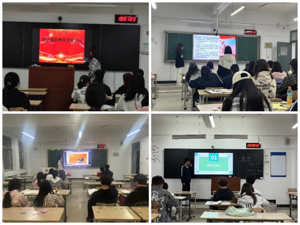 国际经济与贸易B2301班主要围绕着理想信念与个人成长、理想信念与社会发展、理想信念与中国梦的实现三个方向开展;大数据管理与应用B2301班主要围绕积极的心态是成功的一半这一主题开展;电子商务B2301班主要围绕着当代大学生关于如何培育理想信念的问题开展;金融工程B2301班分别围绕“理想”与“信念”两个方面带领同学们开展学习。
