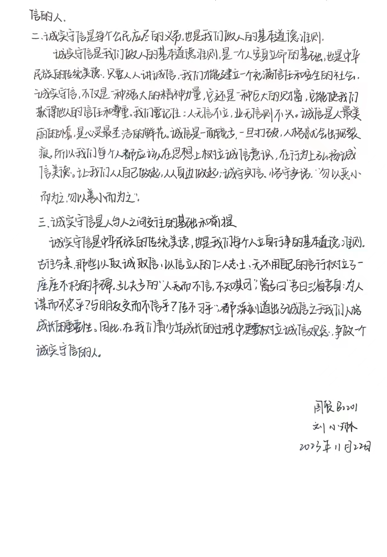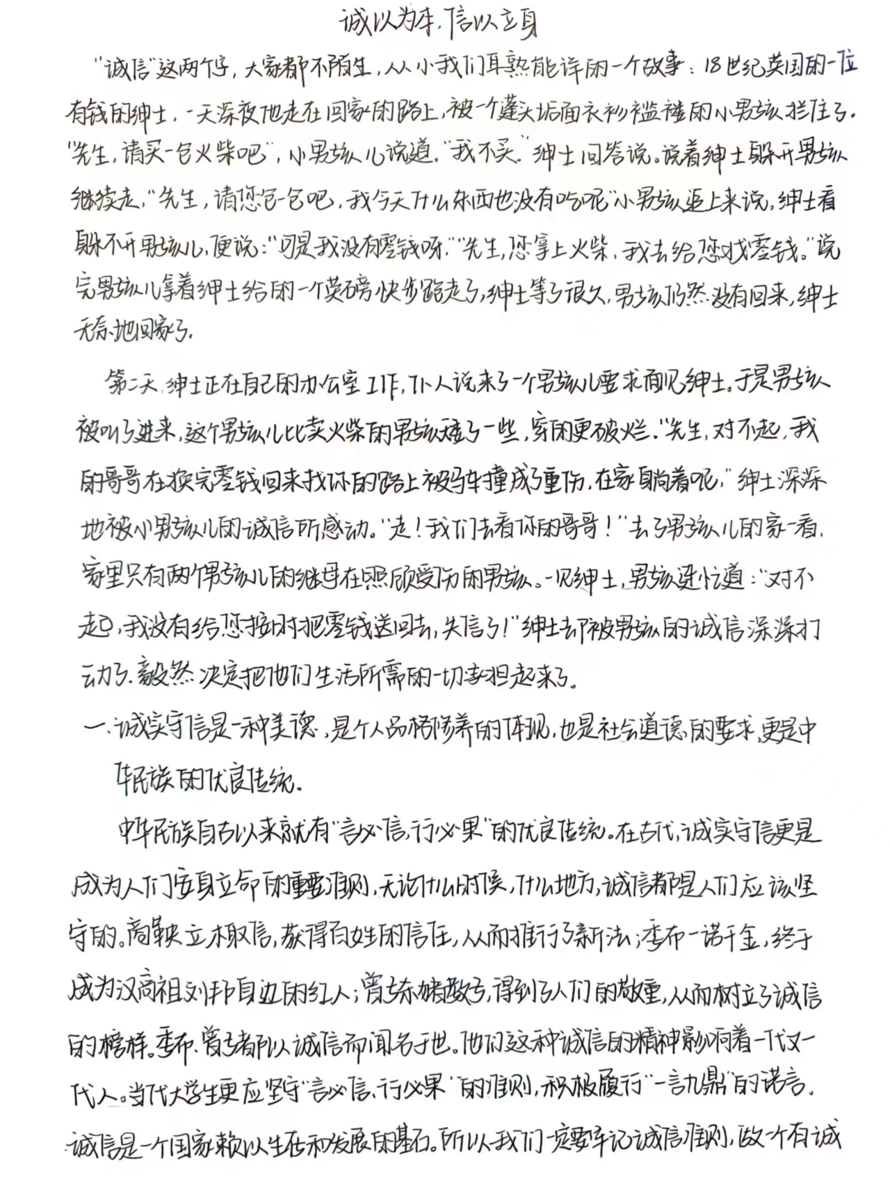人而无信,不知其可也、言必诚信,行必忠正。诚实守信,是为人之本,是中华民族的传统美德。诚实,是指忠诚老实,言行一致,表里如一;守信,是指说话、办事讲信用,答应了别人的事,能认真履行诺言,说到做到。守信是诚实的一种表现。中华民族历来崇尚诚信。古往今来,关于诚信的正反面故事举不胜数。诚实守信是人类千百年传承下来的优良道德品质。诚信既是个人道德的基石,又是社会正常运行不可或缺的条件。诚信缺失的个人将失去他人的认可,诚信缺失的社会将失去人与人之间正常关系的支撑。“诚信”是人们之间正常沟通、社会生活稳定和经济秩序维护与发展的重要力量。对一个人来说,“诚实守信”不仅是一种道德品质和道德信仰,也是每个公民的道德责任,是一种高尚的“人格力量”。在现代社会,随着社会主义市场经济的不断发展,“诚信”在社会政治生活、经济生活、文化建设和道德风尚中的重要地位日益显现。诚信伴我成长,诚信蔚然成风,下面让我们一同品鉴同学们对诚信的认识,透过文字见诚信!