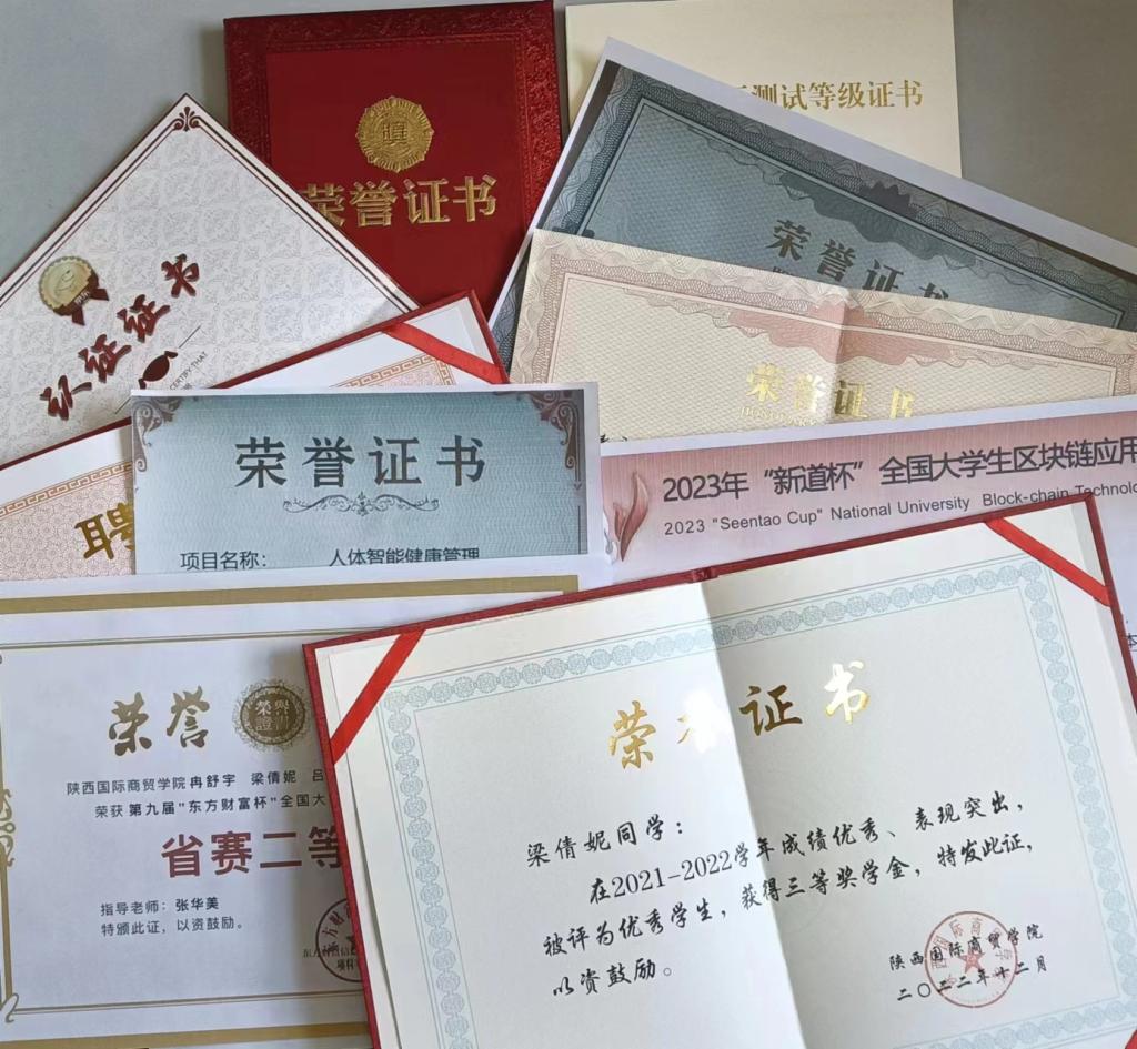 大学期间,曾在2021-2022学年获得优秀学生荣誉证书、2023年6月获得“新道杯”全国大学生区块链应用技能大赛西北区三等奖、2023年6月获得第九届“东方财富杯”全国大学生金融挑战赛省赛二等奖、2023年4月获得陕西国际商贸学院第九届中国国际“互联网+”二等奖、在京东实训中获得优秀学员证书、