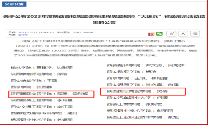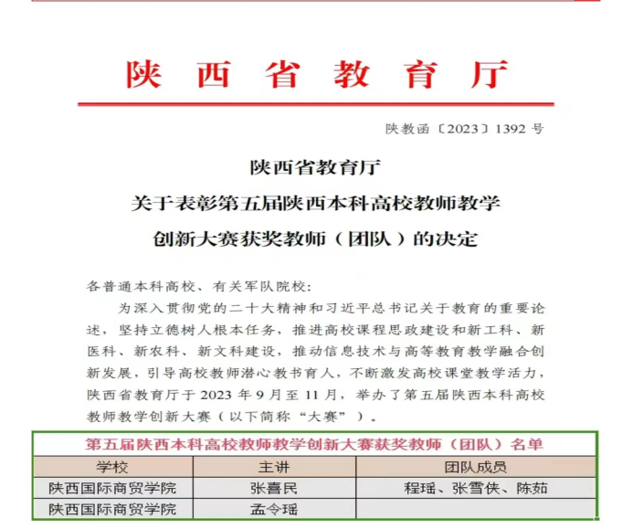 学院秉承以赛促教、以赛促学、以赛促建、以赛促改的理念,充分发挥获奖教师的示范引领作用,助力学院教师教学水平迈上新台阶。本年度教师在教学竞赛方面实现国家级、省级突破。省级以上各类竞赛获奖达到8项。获得第五届陕西本科高校教师教学创新大赛三等奖1项;1人获得陕西省课程思政教学能手;第五届全国高校混合式教学设计创新大赛优胜奖2项;第九届全国应用型人才综合技能大赛一等奖1项和三等奖2项;第五届全国数字贸易教师实践教学能力竞赛二等奖1项;校级课青年教师讲课大赛一等奖和课堂教学创新大赛一等奖2项,教学设计单项奖1项;校级课程思政大练兵活动二等级1项、三等奖1项、优秀奖2项。