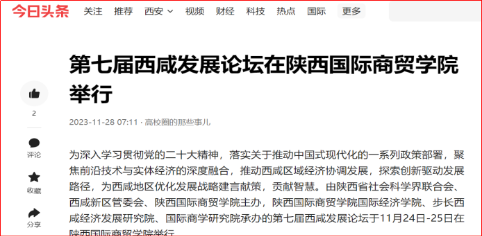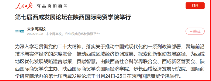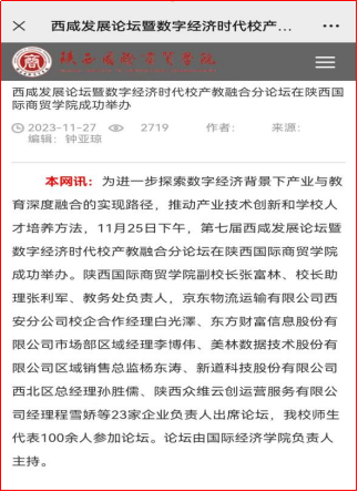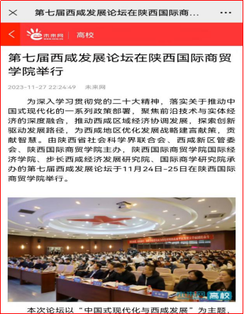 人民日报、今日头条、三秦都市报、中国教育新闻网、网易新闻、澎湃陕西、新浪新闻、陕西国际商贸学院官微等10余家主流媒体对我院第七届西咸发展论坛进行报道,进一步提升了学院影响力。