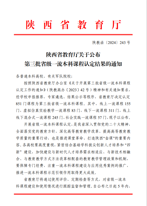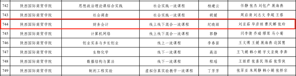 近日,陕西省教育厅公布了第三批省级一流课程认定结果,管理学院《财务会计》课程被认定为省级线上线下混合式一流课程。至此,我院共获批省级一流课程3门。这既是学院深化教育教学改革,推进教育数字化的阶段性成果,也是我院高度重视课程建设,鼓励教师开展教学课程改革,促进信息技术与教学过程深度融合,努力提高课堂教学成效的成果。