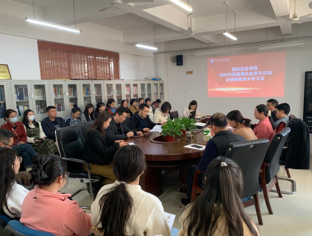 为全面提升师德师风建设工作水平,贯彻落实《陕西国际商贸学院2024年师德师风建设活动实施方案》通知精神,3月21日下午,国际经济学院在西咸会议室召开师德师风建设年工作启动会暨师德集中学习会,学院班子成员及全体教职工参加会议,会议由党总支副书记荣超主持。