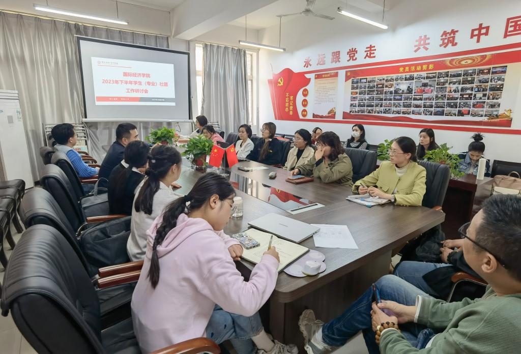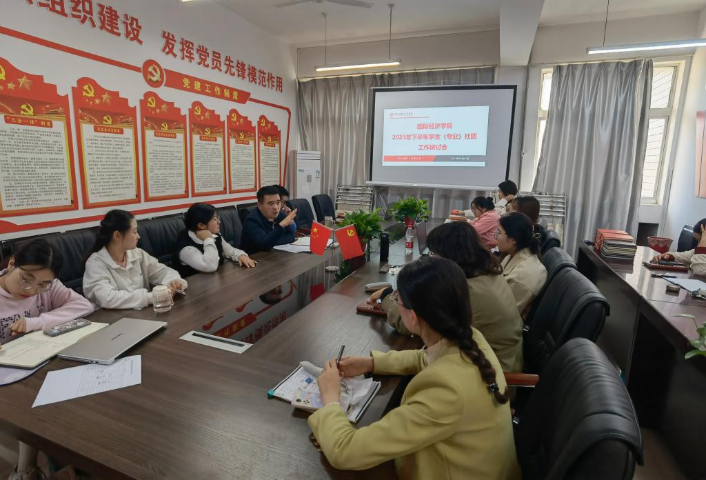 10月28日下午,国际经济学院在党员活动室会召开专业社团及学业导师工作研讨会,本次研讨会由学院党总支副书记荣超主持,学院周启清博士、各社团指导教师、学业导师及各班级辅导员参会。