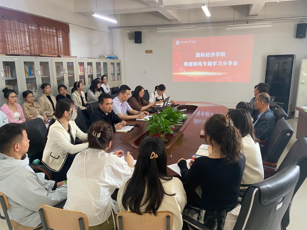 为了造就一支理想信念坚定、师德师风高尚、专业水平高超的高素质专业化教师队伍,根据《陕西国际商贸学院 2024 年师德师风建设活动实施方案》,结合学院师德师风建设实际,4月17日下午,国际经济学院在西咸会议室召开师德师风专题学习分享会,学院班子成员及全体教职工参加会议,会议由党总支副书记荣超主持。