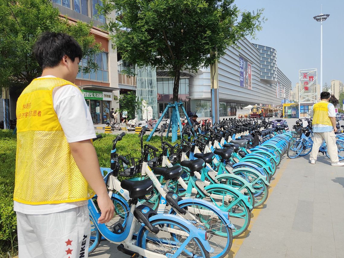 通过线上方式召集20-30名志愿者,通知活动时间地点后将人员集中,叮咛活动内容和有关注意安全事项。志愿者在集合地点领取摆放单车的工具并分组,志愿者将散乱的单车收集起来推到手推车上,运送到指定的停车进行摆放。组织人员有序进入志愿活动区域,进行有秩序的管理。志愿者在摆放单车的过程中,对市民进行文明骑行的宣传和引导。同时,他们还积极向市民宣传文明出行的理念,引导市民规范使用共享单车。