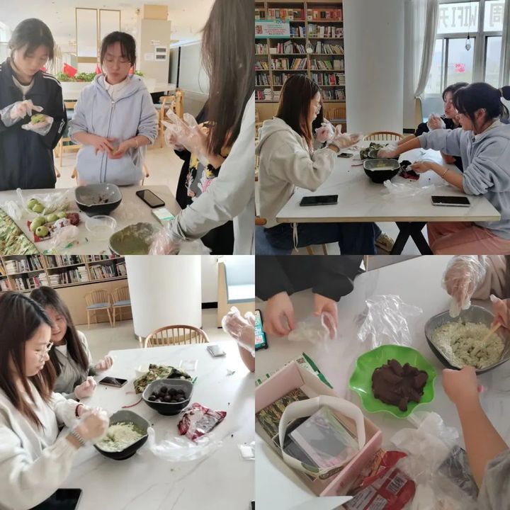 活动现场,同学们围坐在一起,脸上洋溢着兴奋和期待的笑容,在欢乐的氛围下一起学习制作青团以及糯米粉、青艾汁、各种馅料……同学们忙得不亦乐乎。有人负责和面,有人负责准备馅料,有人负责包裹成型,大家各司其职,互相协作。