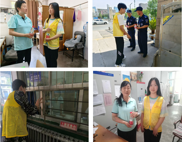 炎炎夏日,骄阳似火,活动初始,由各支部团支书带领团员进行校园夏季温暖送水活动。同学们慰问了校园里的宿管阿姨和保卫叔叔,详细了解他们的身体状况和高温防暑措施落实情况,为了表达对他们辛勤工作的感激之情,学生们用实际行动为他们送上了一份清凉和关怀,以及向他们的辛勤付出表示了感谢与赞美。