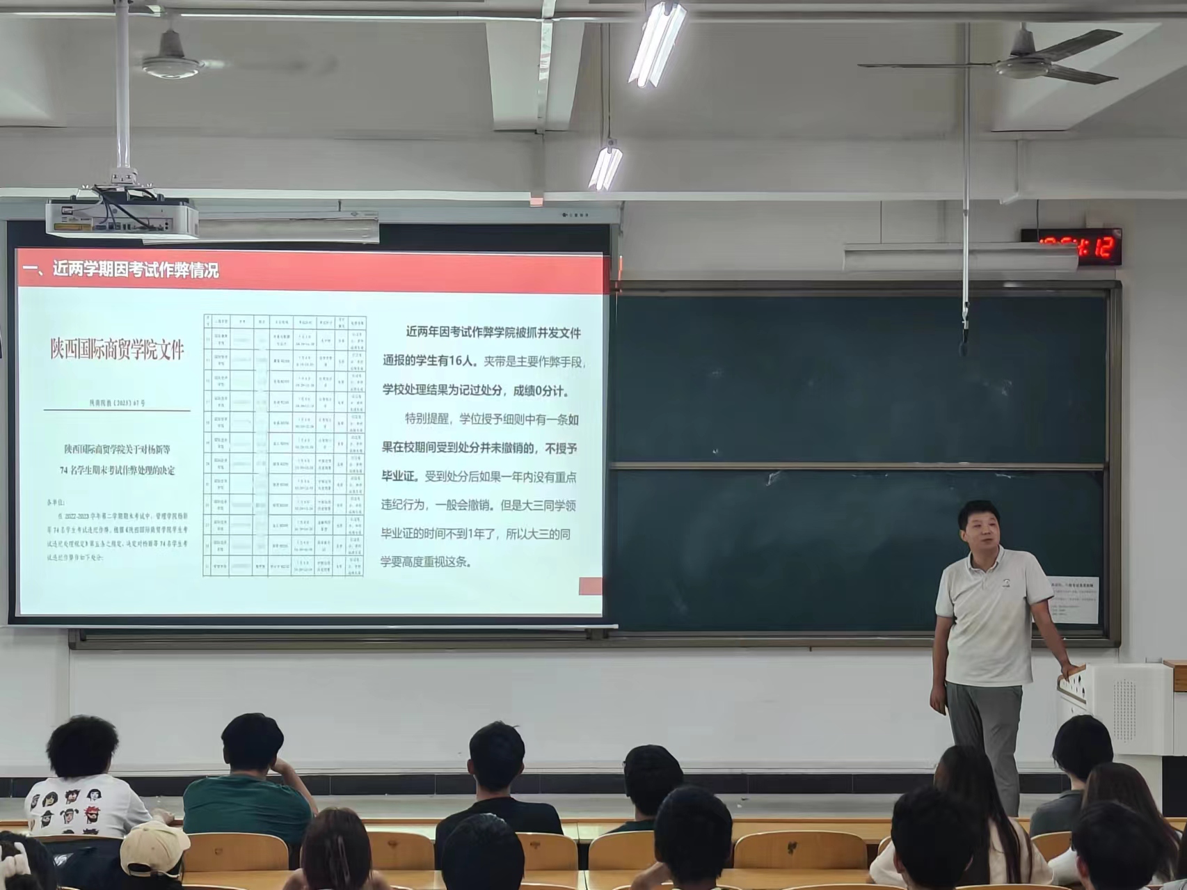 为了更好地维护良好学风,维持考试纪律,规范日常要求。2024年6月24-28日,国际经济学院各年级陆续开展主题为“认真备考,诚信考试”的主题班会,会议分别由各年级辅导员老师主持,全体学生参加。此次班会旨在加强同学们的考试纪律意识,培养良好的学习习惯和诚信品质,为即将到来的期末考试做好充分准备。