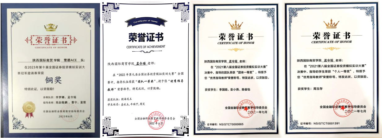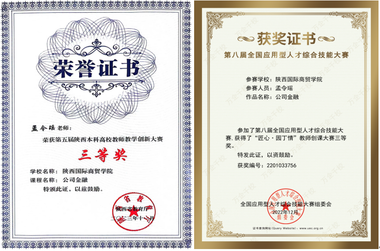 初此站上讲台,她便深知教学改革的重要性。她经常说在教学过程中,教师要想给学生一杯水,不光要有一桶水,还得是活水源源不断,为能够让这水活起来,她便持续坚持教学改革。针对主讲课程她精心设计每一个教学环节,并充分在教学实践中尊重学生的建议,以学生为中心,搜集并开发与生活贴近的场景案例,通过将这些案例引入课堂,分析讨论,真正让学生用知识解决生活中的金融问题。通过这样的教学设计,学生们恍然大悟,开心地说道:“金融可以如此的生活与具象化”。与此同时,她加强课程资源的建设,挖掘生活中以及现实企业的案例,不断尝试将这些案例以更为生动地形式呈现在课堂上,再通过引导学生一起开发案例、讨论案例,研究案例,充分挖掘学生的探索欲。通过努力,孟老师主讲的《公司金融》课程先后获得教育部协同育人规划项目、省级一流课程项目。在教学创新的过程中,困难和挑战时常会有,但她常说这些经历往往能促使自己思考更深层次的问题,寻找更有效的解决方案,学生的成长是她坚持教学改革的动力与底气。在这场双向奔赴的热爱中,她通过努力获得第五届陕西本科高校教师教学创新大赛三等奖;全国应用型人才技能大赛教师创课大赛一等奖等多项教学竞赛奖励。