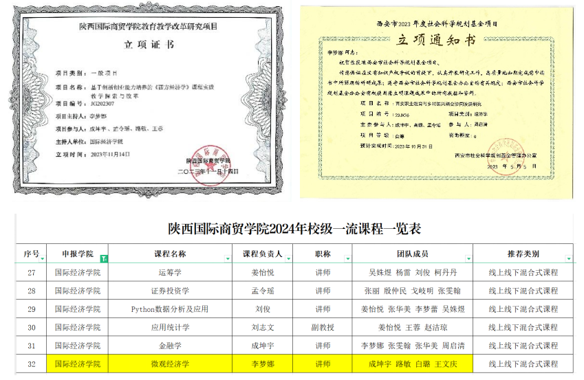 把学生教好,让学生成功,是她最大的心愿。李梦娜老师在教育教学工作中,时时以一个好教师的身份来约束自己、鞭策自己,积极开展政治理论学习和教育教学理论学习,力争在思想上、工作上取得进步,做到教书育人、言传身教、为人师表,以自己的人格、行为去感染学生,努力使学生能接受自己、喜欢自己。在教学工作中,她具备扎实的专业知识和较高的教育教学能力。在日常教学中,能够灵活运用多种教学方法和手段,激发学生的学习兴趣,提高课堂效率,还不断学习新的教育教学理念和技术,努力提升自己的专业技能。先后承担《微观经济学》《宏观经济学》《金融数学》等课程的教学工作,学生评教结果较好。同时,在课程建设方面取得了较为丰富的成果,作为主持人,完成《微观经济学》课程思政示范课建设和应用型课程建设,并获批校级线上线下混合式一流课程建设,完成《经济学沙盘模拟实验》课程虚拟仿真一流课程建设,《趣味经济学》获批校级DNA课程,在校内外各类教学竞赛中获奖5项,作为参与人获得校级教学成果奖2项。作为一名高校教师他深知科研工作的重要性,采取多项措施不断提升自己科研能力,近六年,主持课题5项,其中纵向课题4项,横向课题1项,参与课题10项,其中纵向课题8项,横向课题3项,公开发表论文6篇,参编专著1部。