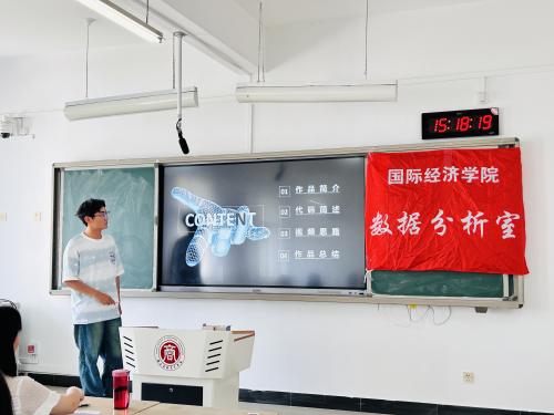大赛第二项由数据分析室社团指导老师杨雷说明此次比赛规则,本次比赛不分赛道进行,最终成绩由参赛视频、路演展示及使用代码三部分组成,依次占比为50%、25%、25%,出席本次大赛的评委有国际经济学院副院长张丽、大数据应用教研室主任姜怡悦以及刘俊老师。