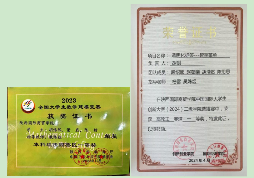 个人荣誉:第九届“东方财富杯”全国大学生金融挑战赛省赛三等奖,第六届全国高校经济决策虚仿实验大赛“国际经济分析与决策”竞赛三等奖,2023全国大学生英语竞赛(NECCS)C类三等奖,陕西国际商贸学院2022年度优秀共青团员,2022-2023优秀志愿者,2023年“学习二十大,青春心向党”青年大学习知识竞赛二等奖,2023全国大学生数学建模竞赛本科组陕西赛区一等奖,第一届全国大学生数字创新能力大赛二等奖,第二届全国ETF模拟投资菁英赛优秀奖。