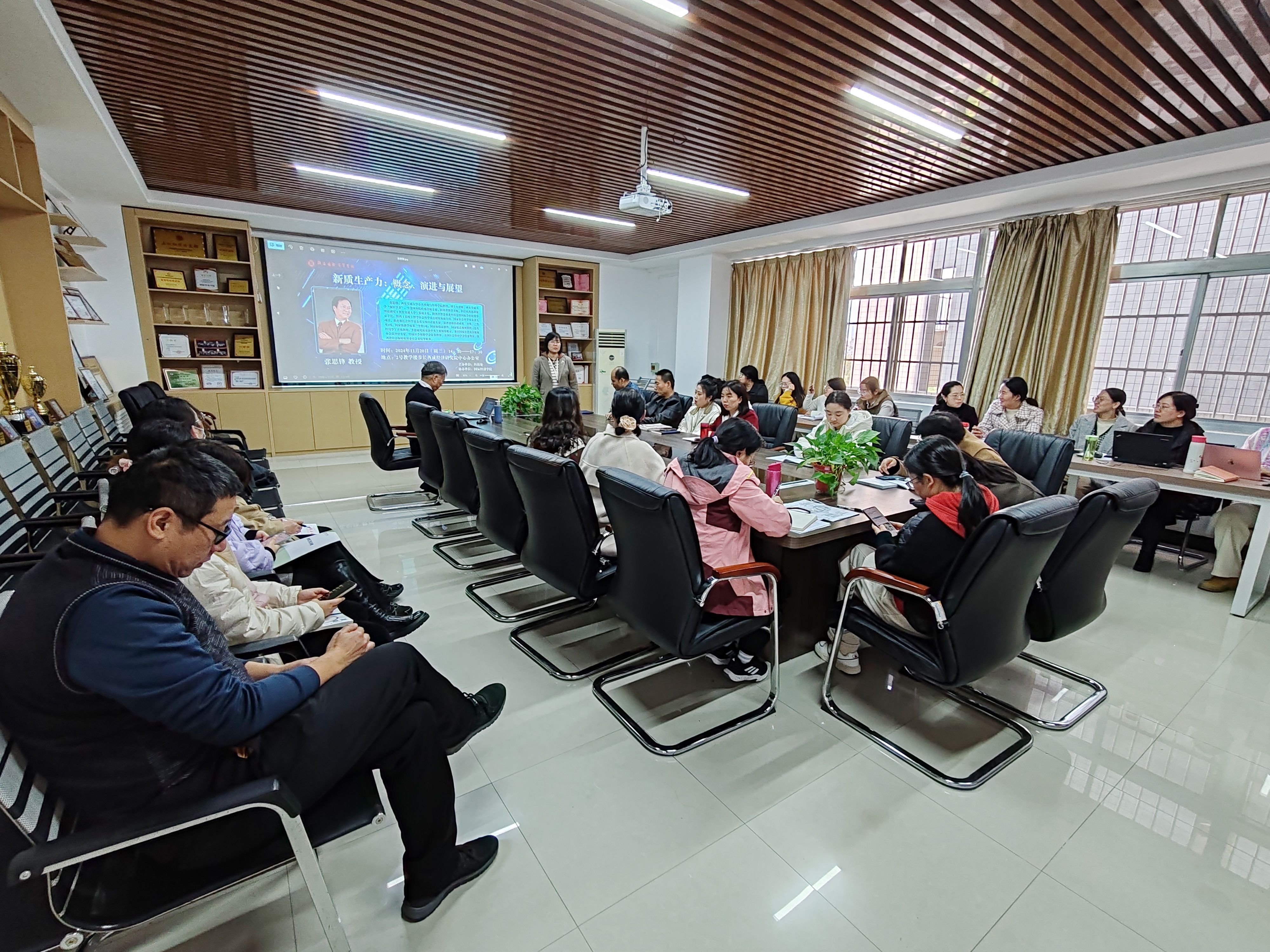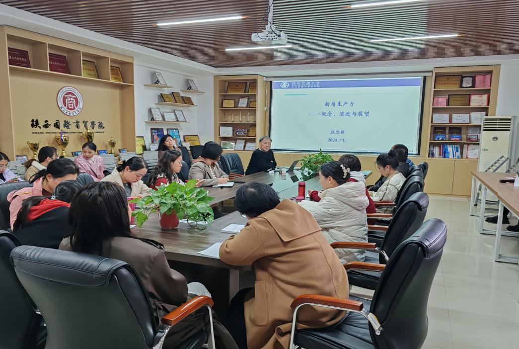 11月20日,国际经济学院在步长西咸经济研究院办公室成功举办了“新质生产力——概念、演进与展望”的科研讲座。此次讲座旨在深入探讨新质生产力的内涵、数字经济与产业智能化以及适应新质生产力的新型生产关系,为学院的师生提供一个学术交流与思想碰撞的平台;讲座邀请了西安交通大学公共政策与管理学院教授、博士生导师张思锋教授作为主讲嘉宾。会议由张丽副院长主持,全体教师参加会议。