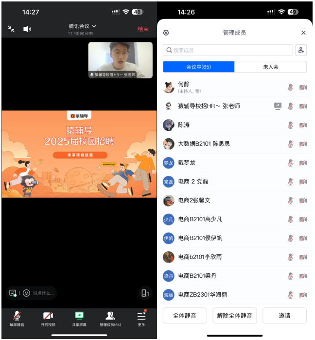 为拓宽学生就业渠道,搭建企业与学生的沟通桥梁,2024年11月26日下午,国际经济学院组织猿辅导线上校园招聘会。招聘会由21级辅导员何静主持,25届毕业生参加。