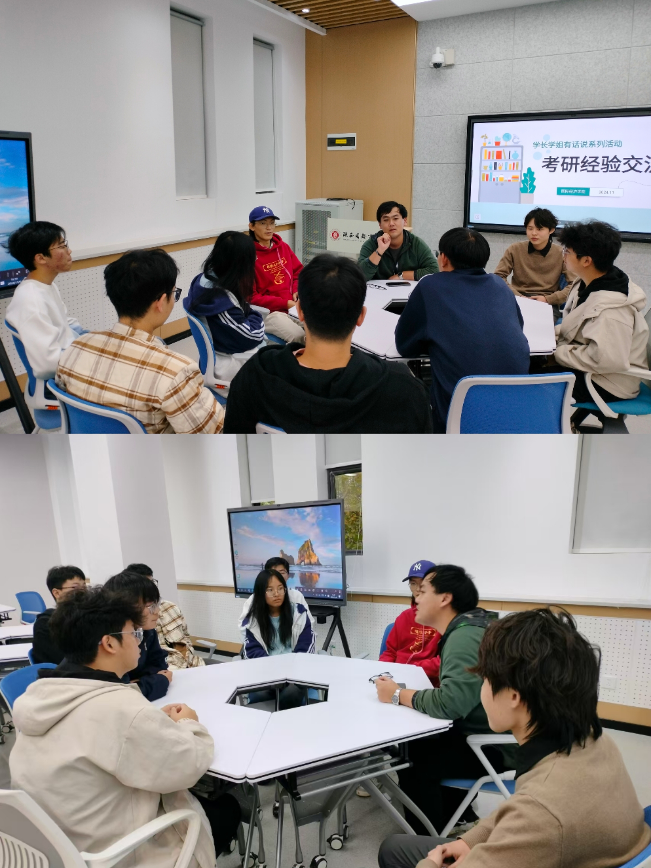 为给准备备考的2026届本科毕业生加油助威,帮助解决备考过程中遇到的实际困难,增强考研信心,11月29日,国际经济学院在7教207教室开展考研交流活动。学院考入西北大学的2023届毕业生张齐宇和他的研究生同学陈星宇,张云程、辅导员刘翔、岳琪峰及2026届考研学生代表参会。