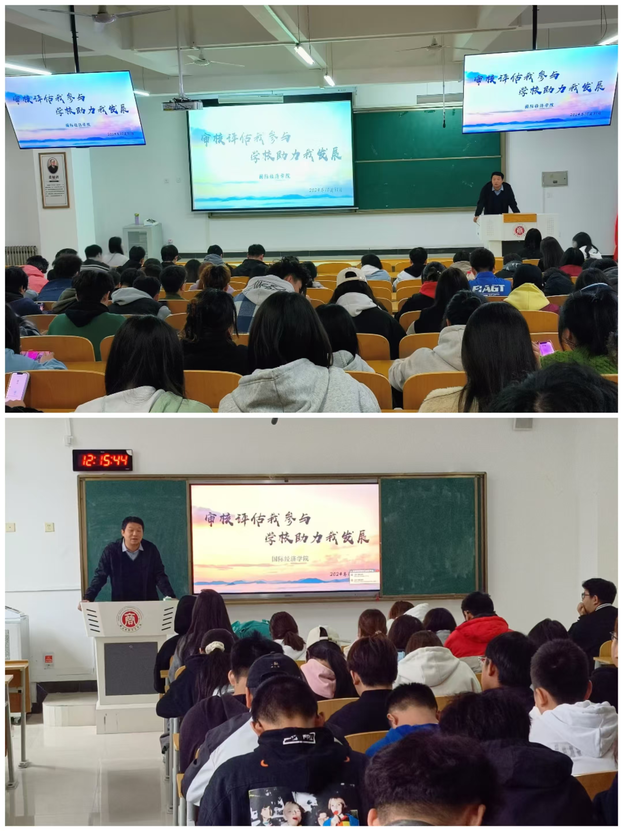 为更好迎接本科教育教学审核评估专家进校工作,进一步加强学风建设,增强学生参与本科教育教学审核评估工作的责任感与积极性,营造全院上下人人关心评估、人人了解评估、人人参与评估的浓厚氛围。2024年10月28日至30日晚自习,国际经济学院各班级相继召开“审核评估我参与,学校发展我助力”主题班会。