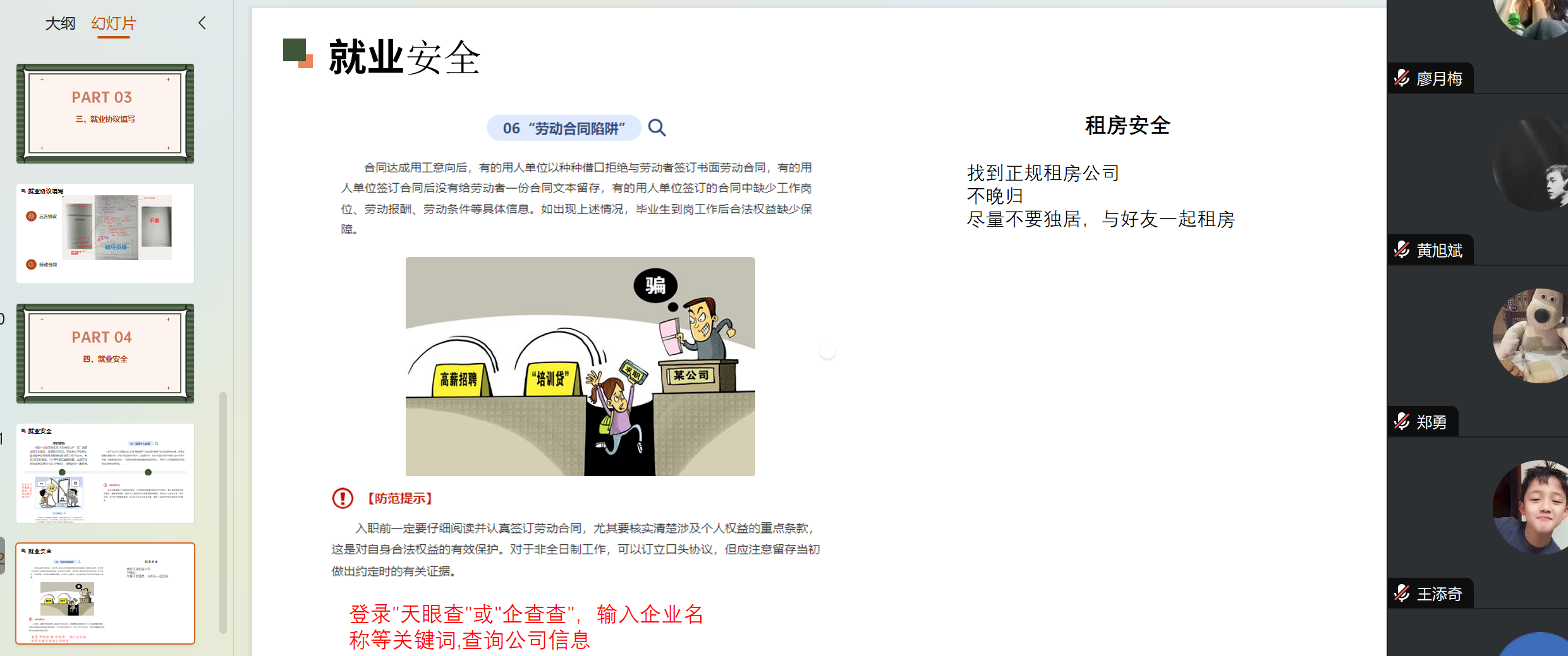 会议伊始,何老师围绕毕业生阶段性任务进行系统部署,针对当前就业环境与政策展开深度剖析。她结合近年来就业市场趋势,指出“主动出击、精准定位”是破解求职难题的关键,并详细梳理了线上线下就业信息获取渠道,涵盖国家大学生就业服务平台、校企合作资源及行业专场招聘会等。在就业安全教育环节,何老师以案例为引,从人身安全、财产安全、防范传销陷阱及信息甄别四大维度展开警示宣讲。她提醒毕业生需警惕“高薪陷阱”“虚假招聘”等风险,强化法律维权意识,建议通过官方平台核实企业资质、签订规范劳动合同。