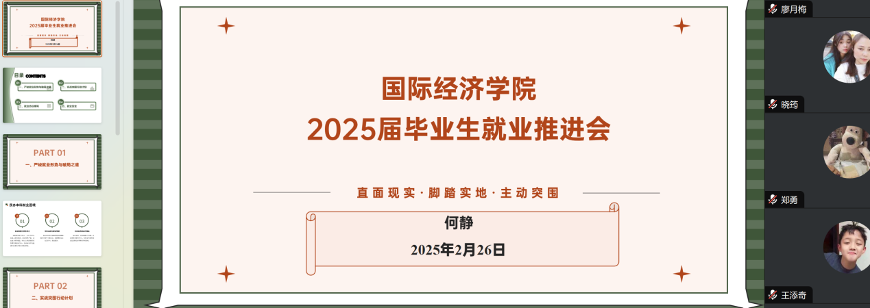 为进一步做好2025届毕业生就业工作,加强对毕业生就业的指导与帮助,多渠道为毕业生提供就业渠道,确保毕业生顺利就业及提高毕业生就业安全意识。国际经济学院于2月26日21:00通过腾讯会议召开了2025届毕业生就业推进会。本次会议由辅导员何静老师主持召开,2025届全体毕业生参会。
