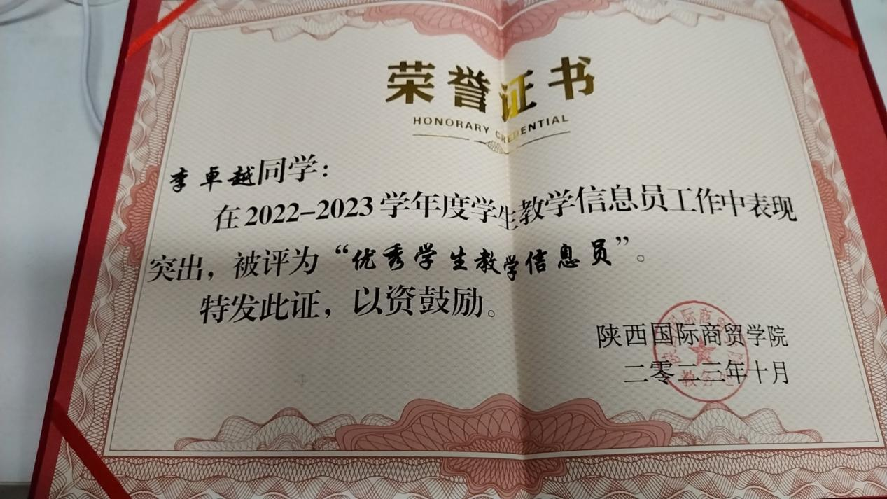 李卓越,女,共青团员,来自陕西西安,现就读于陕西国际商贸学院国际经济学院大数据管理与应用B2201班,并担任该班学委,同时担任国际经济学院教学信息员。