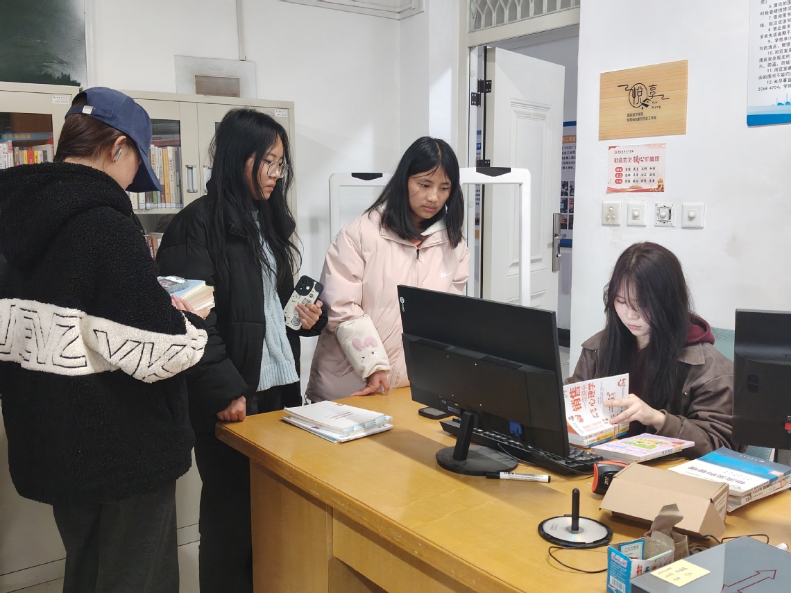 书架前瞬间热闹起来,大家或是独自专注搜寻,或是三两成群轻声讨论,眼神中满是对知识的渴望。在人文社科类书架旁,一位同学拿起一本关于哲学思想的书籍,仔细翻阅,脸上露出若有所思的神情;另一边,自然科学区域,有同学为找到一本前沿的科学研究著作而欣喜不已。借阅活动在我室工作人员的引导下有序进行。