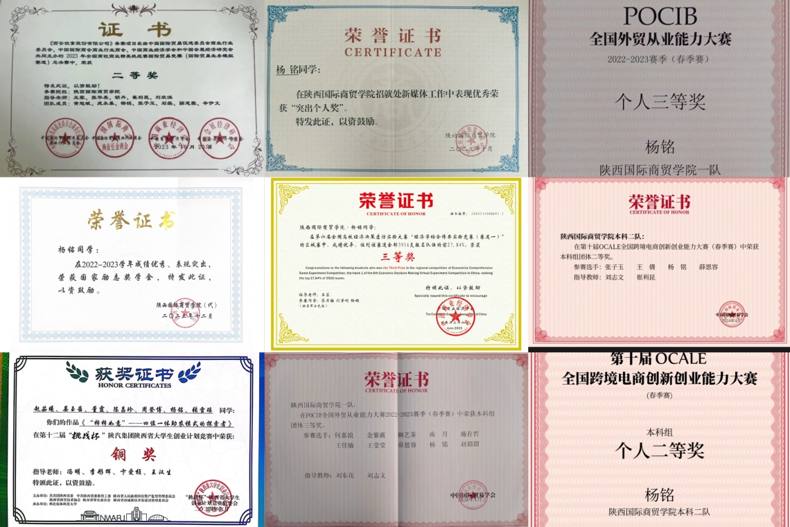 个人荣誉:2023-2024年国家奖学金,2021-2022年国家励志奖学金,2022-2023年国家励志奖学金,第九届中国国际“互联网+”大学生创新创业大赛省级银奖,全国高校商业精英挑战赛国际贸易竞赛总决赛二等奖,第十二届“挑战杯”陕汽集团陕西省大学生创业计划竞赛铜奖,第十二届POCIB全国外贸从业能力大赛(春季)团队及个人三等奖,第十届OCALE全国跨境电商创新创业能力大赛团队及个人二等奖,第六届全国高校经济决策虚仿实验大赛三等奖,“中外传播杯”全国大学生英语阅读大赛一等奖,“创新实践杯”全国大学生英语词汇竞赛一等奖,益阳市大学生暑期“返家乡”社会实践活动优秀实习生等荣誉