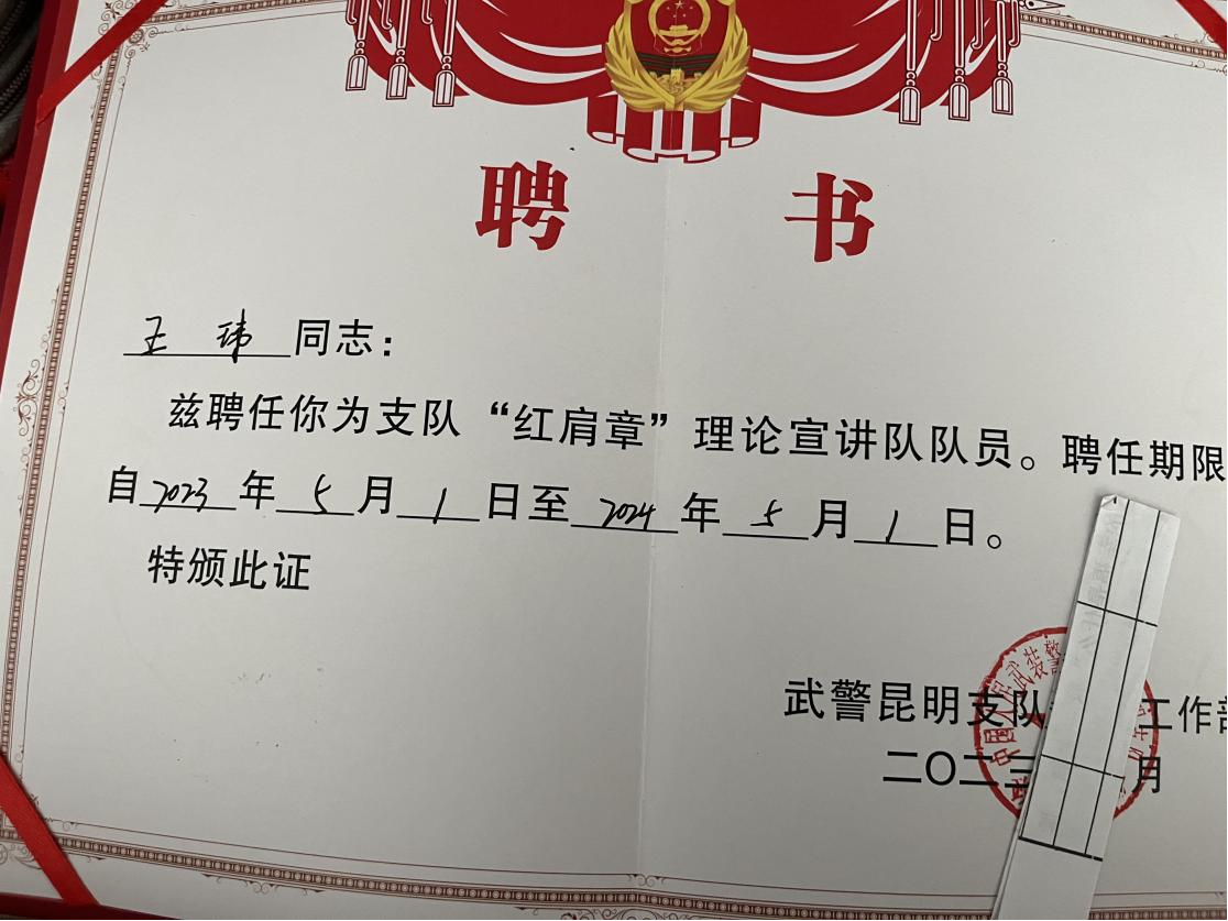 个人荣誉:武警云南省总队昆明支队“红肩章”理论宣讲队队员、优秀学员。武警云南省总队昆明支队某中队副班长。