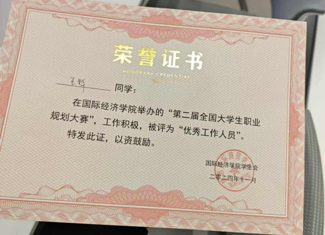 养成收获:获得国际经济学院学生会中优秀工作者,参加数次活动的工作人员,参加一场激烈的辩论赛。
